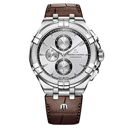 1. Maurice Lacroix Aikon Chronograph AI1018-SS001-130-1 Корпус из нержавеющей стали с сатинированной отделкой поверхности и полированной отделкой декоративных звеньев. Серебристый сатинированный циферблат: центральные стрелки с алмазной обработкой, родиевым покрытием и люминесцирующими вставками на стрелках часов и минут; условные индексы с родиевым покрытием, малая секундная стрелка, 30-минутный счётчик, счётчик 1/10 секунды, окошко даты. Коричневый ремешок из телячьей кожи с узором под кожу аллигатора с накладным полированным серебристым логотипом, с двойной раскладывающейся застёжкой из нержавеющей стали на двух кнопках с сатинированной и полированной отделкой и круговым зернением. |