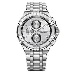 3. Maurice Lacroix Aikon Chronograph AI1018-SS002-130-1 Корпус из нержавеющей стали с сатинированной отделкой поверхности и полированной отделкой декоративных звеньев. Серебристый сатинированный циферблат: центральные стрелки с алмазной обработкой, родиевым покрытием и люминесцирующими вставками на стрелках часов и минут; условные индексы с родиевым покрытием, малая секундная стрелка, 30-минутный счётчик, счётчик 1/10 секунды, окошко даты. 5-рядный браслет из нержавеющей стали с сатинированной отделкой, с двойной раскладывающейся застёжкой из нержавеющей стали на двух кнопках с сатинированной и полированной отделкой и круговым зернением. |