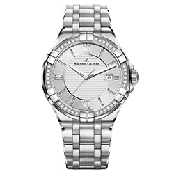 2. Maurice Lacroix Aikon Gents AI1008-SD502-130-1 Корпус из нержавеющей стали с полированной отделкой поверхности, безеля и декоративных звеньев. Безель инкрустирован тридцатью шестью бриллиантами огранки TW, диаметром 1,4 мм и общим весом 0,37 карата. Серебристый сатинированный циферблат с контрастной отделкой в центре в технике гильоше в виде широких горизонтальных полос: центральные стрелки с алмазной обработкой и родиевым покрытием, люминесцентными вставками на стрелках часов и минут; условные индексы, римские цифры и окошко даты с родиевым покрытием. Браслет из нержавеющей стали с пятью рядами звеньев с сатинированной и полированной отделкой, с двойной раскладывающейся застёжкой из нержавеющей стали на двух кнопках с сатинированной и полированной отделкой и круговым зернением. |