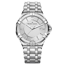 6. Maurice Lacroix Aikon Gents AI1008-SS002-131-1 Корпус из нержавеющей стали с полированной отделкой поверхности, безеля и декоративных звеньев. Серебристый сатинированный циферблат: центральные стрелки с алмазной обработкой и родиевым покрытием, люминесцентными вставками на стрелках часов и минут; условные индексы, римские цифры и окошко даты с родиевым покрытием. Браслет из нержавеющей стали с пятью рядами звеньев с сатинированной и полированной отделкой, с двойной раскладывающейся застёжкой из нержавеющей стали на двух кнопках с сатинированной и полированной отделкой и круговым зернением. |