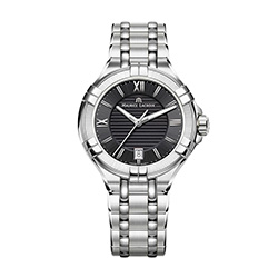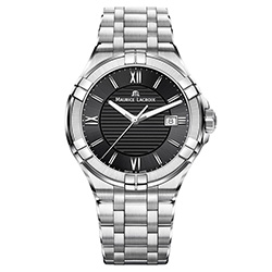 8. Maurice Lacroix Aikon Gents AI1008-SS002-331-1 Корпус из нержавеющей стали с полированной отделкой поверхности, безеля и декоративных звеньев. Чёрный сатинированный циферблат: центральные стрелки с алмазной обработкой и родиевым покрытием, люминесцентными вставками на стрелках часов и минут; условные индексы, римские цифры и окошко даты с родиевым покрытием. Браслет из нержавеющей стали с пятью рядами звеньев с сатинированной и полированной отделкой, с двойной раскладывающейся застёжкой из нержавеющей стали на двух кнопках с сатинированной и полированной отделкой и круговым зернением. |