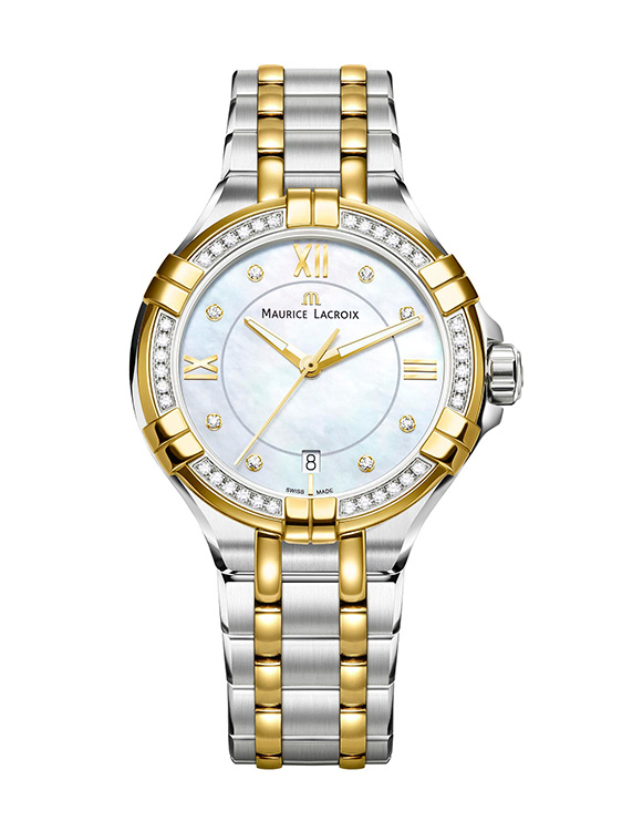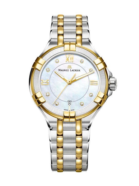 1. Maurice Lacroix Aikon Ladies AI1006-DY503-171-1 Корпус из нержавеющей стали с полированной отделкой поверхности, безеля и декоративных звеньев. Внешняя кромка безеля и декоративные звенья – с жёлто-золотым PVD-покрытием. Безель инкрустирован тридцатью шестью бриллиантами огранки TW, диаметром 1,2 мм и общим весом 0,25 карата. Перламутровый, с голубым оттенком, циферблат: центральные стрелки с PVD-покрытием жёлтым золотом и люминесцирующими вставками на стрелках часов и минут; восемь бриллиантов огранки TW, диаметром 1,2 мм и общим весом 0,05 карата в роли условных индексов, римские цифры с жёлто-золотым PVD-покрытием, окошко даты. Браслет из нержавеющей стали с пятью рядами звеньев из нержавеющей стали с сатинированной и полированной отделкой, чётными рядами звеньев с жёлто-золотым PVD-покрытием, с двойной раскладывающейся застёжкой из нержавеющей стали на двух кнопках с сатинированной и полированной отделкой и круговым зернением. |