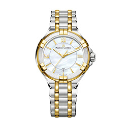 2. Maurice Lacroix Aikon Ladies AI1006-PVY13-160-1 Корпус из нержавеющей стали с полированной отделкой поверхности, безеля и декоративных звеньев. Внешняя кромка безеля и декоративные звенья – с жёлто-золотым PVD-покрытием. Перламутровый, с голубым оттенком, циферблат: центральные стрелки с PVD-покрытием жёлтым золотом и люминесцирующими вставками на стрелках часов и минут; римские цифры и условные индексы с жёлто-золотым PVD-покрытием, окошко даты. Браслет из нержавеющей стали с пятью рядами звеньев из нержавеющей стали с сатинированной и полированной отделкой, чётными рядами звеньев с жёлто-золотым PVD-покрытием, с двойной раскладывающейся застёжкой из нержавеющей стали на двух кнопках с сатинированной и полированной отделкой и круговым зернением. |