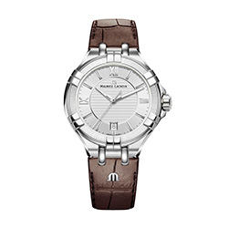5. Maurice Lacroix Aikon Ladies AI1006-SS001-130-1 Корпус из нержавеющей стали с полированной отделкой поверхности, безеля и декоративных звеньев. Серебристый сатинированный циферблат с контрастной отделкой в центре в технике гильоше в виде широких горизонтальных полос: центральные стрелки с алмазной обработкой, родиевым покрытием и люминесцирующими вставками на стрелках часов и минут; римские цифры, условные индексы и окошко даты с родиевым покрытием. Коричневый ремешок из телячьей кожи с узором под кожу аллигатора с накладным полированным серебристым логотипом, с двойной раскладывающейся застёжкой из нержавеющей стали на двух кнопках с сатинированной и полированной отделкой и круговым зернением. |