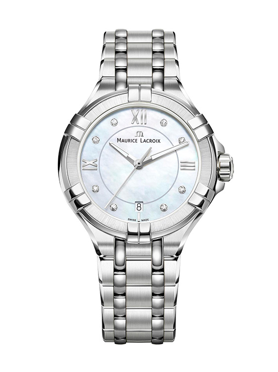 4. Maurice Lacroix Aikon Ladies AI1006-SD502-170-1 Корпус из нержавеющей стали с полированной отделкой поверхности, безеля и декоративных звеньев. Безель инкрустирован тридцатью шестью бриллиантами огранки TW, диаметром 1,2 мм и общим весом 0,25 карата. Перламутровый, с голубым оттенком, циферблат: центральные стрелки с алмазной обработкой, родиевым покрытием и люминесцирующими вставками на стрелках часов и минут; восемь бриллиантов огранки TW, диаметром 1,2 мм и общим весом 0,05 карата в роли условных индексов, римские цифры с родиевым покрытием, окошко даты. Браслет из нержавеющей стали с пятью рядами звеньев из нержавеющей стали с сатинированной и полированной отделкой, с двойной раскладывающейся застёжкой из нержавеющей стали на двух кнопках с сатинированной и полированной отделкой и круговым зернением. |