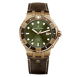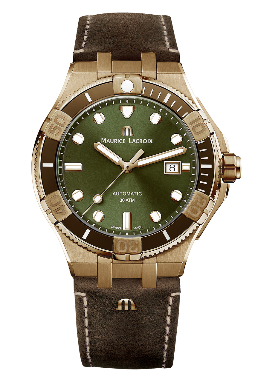 Впервые часы AIKON Venturer выпускаются в бронзе. Корпус диаметром 43 мм выполнен из особого сплава, который с течением времени способен покрываться патиной или темнеть, не разрушаясь при этом. Бронза известна человечеству многие века как самый долговечный материал для изготовления инструментов. Команда разработчиков Maurice Lacroix выбрала этот металл, чтобы подчеркнуть строгую функциональность моделей Venturer, и дополнила новинку подходящим циферблатом насыщенного зеленого цвета с отделкой «солнечные лучи». Гармонию натуральных теплых оттенков продолжает зеленый каучуковый ремешок с геометрическим узором. Благодаря системе Easychange каучуковый ремешок можно легко заменить на винтажный коричневый ремешок из телячьей кожи с бежевой прошивкой. Безель выполнен из коричневой керамики. Выступы на безеле, выполняющие роль часовых меток, выдержаны в стилистике AIKON Venturer. Как и корпус, они изготовлены из бронзы. Данная модель, оснащенная автоматическим механизмом ML 115, выпущена ограниченной серией из 500 экземпляров.