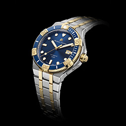 Еще одна новая версия AIKON Venturer выполнена из стали с позолоченными элементами оттенка желтого золота (2N). Если раньше модель была чисто функциональной, то сейчас Venturer предстает в новом свете. Теплый блеск драгоценного металла на звеньях браслета, заводной коронке и характерных для всей коллекции AIKON выступах на безеле придают особую роскошь этим часам. Темно-синий циферблат с отделкой «солнечные лучи» в сочетании с керамическим безелем того же оттенка подчеркивают спортивный характер модели. Выбор желтого золота и насыщенного синего цвета придает этим часам винтажный стиль в духе 80-х – новое направление в палитре Maurice Lacroix. Система замены браслета Easychange позволяет владельцу часов изменять их стиль за долю секунды. Данная модель, оснащенная автоматическим механизмом ML 115, пополнит основную коллекцию AIKON Venturer 43мм.