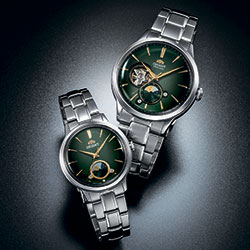 Яркий акцент коллекции составляют лимитированные парные модели с изысканным зеленым градиентным циферблатом с золотыми стрелками, выпущенные к 70-летнему юбилею Orient тиражами 1000 шт. (мужские часы) и 500 шт. (женcкие часы).