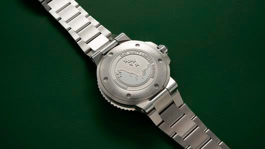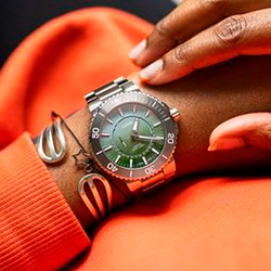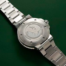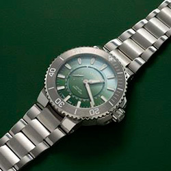 Часы также отличаются необычным круговым указателем даты, который запитывается автоматическим швейцарским механизмом. С их водонепроницаемостью до 30 бар (300 м), часы готовы к любым приключениям в морских глубинах.