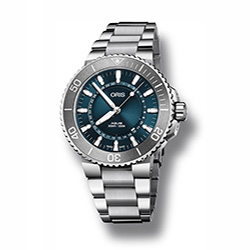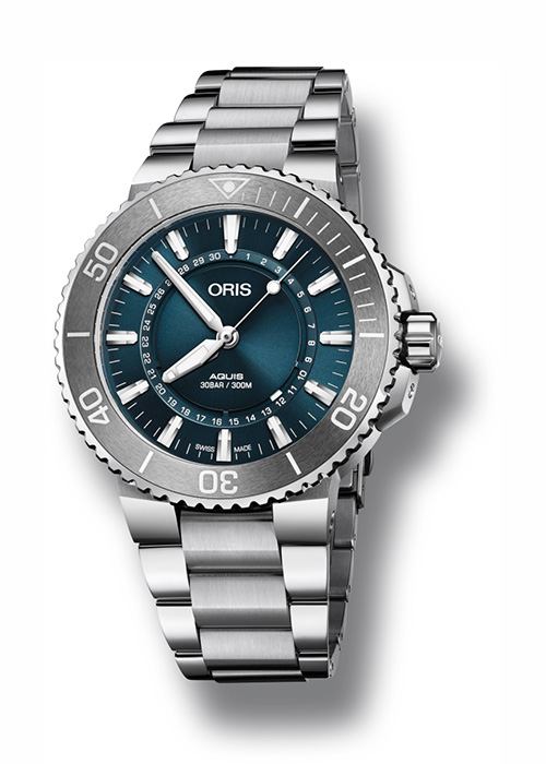 - Серый каучуковый ремешок с разработанным Oris предохранительным якорем, удлинителем и раскладывающейся застежкой с устройством быстрой настройки длины ремешка. Также в наличии модель на стальном браслете с удлинителем;