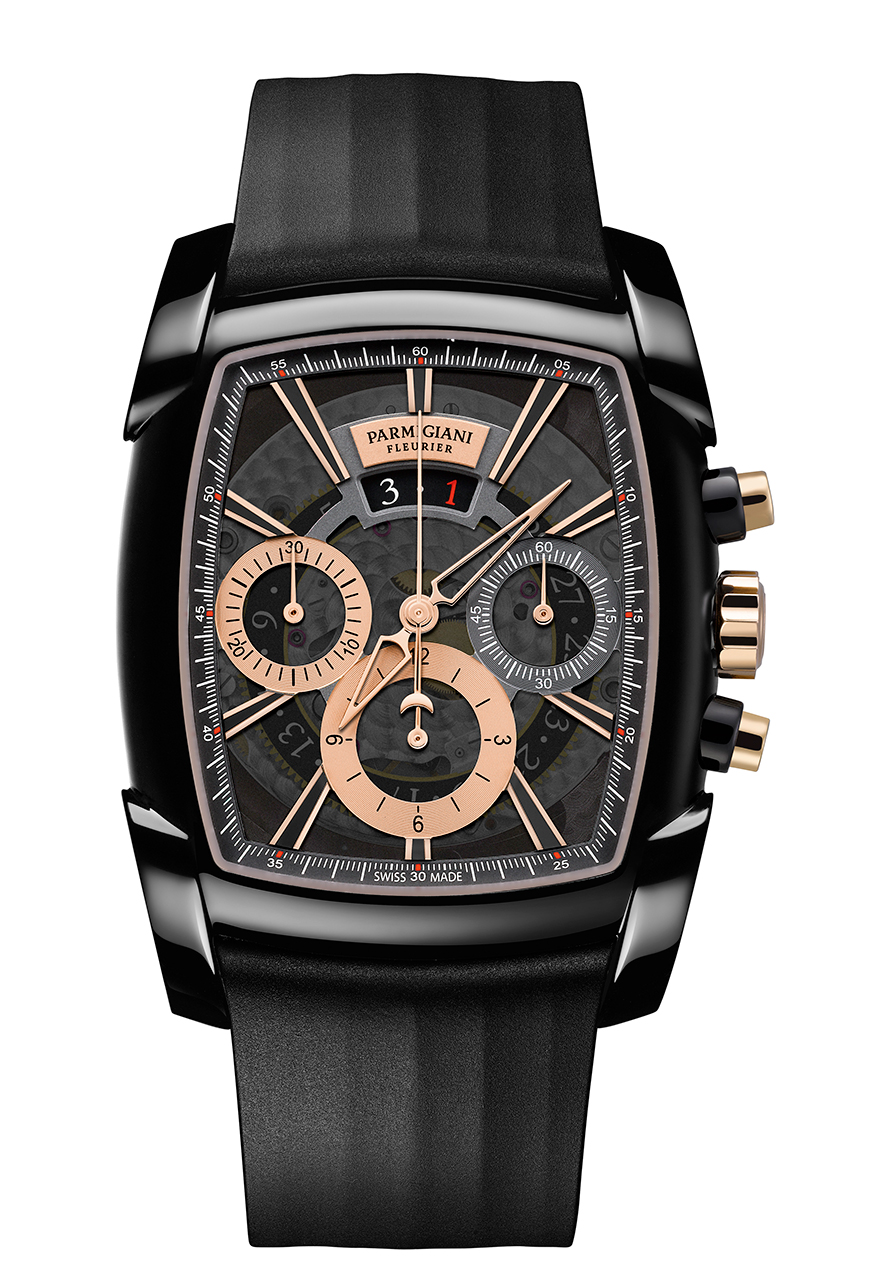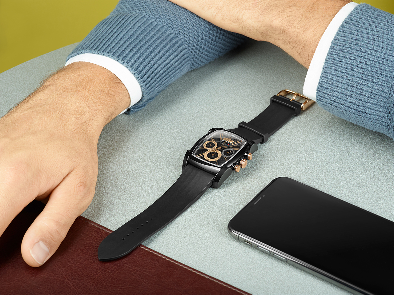 - Полированная сталь с черным ADLC покрытием, заводная головка и кнопки хронографа из 18-каратного полированного розового золота.