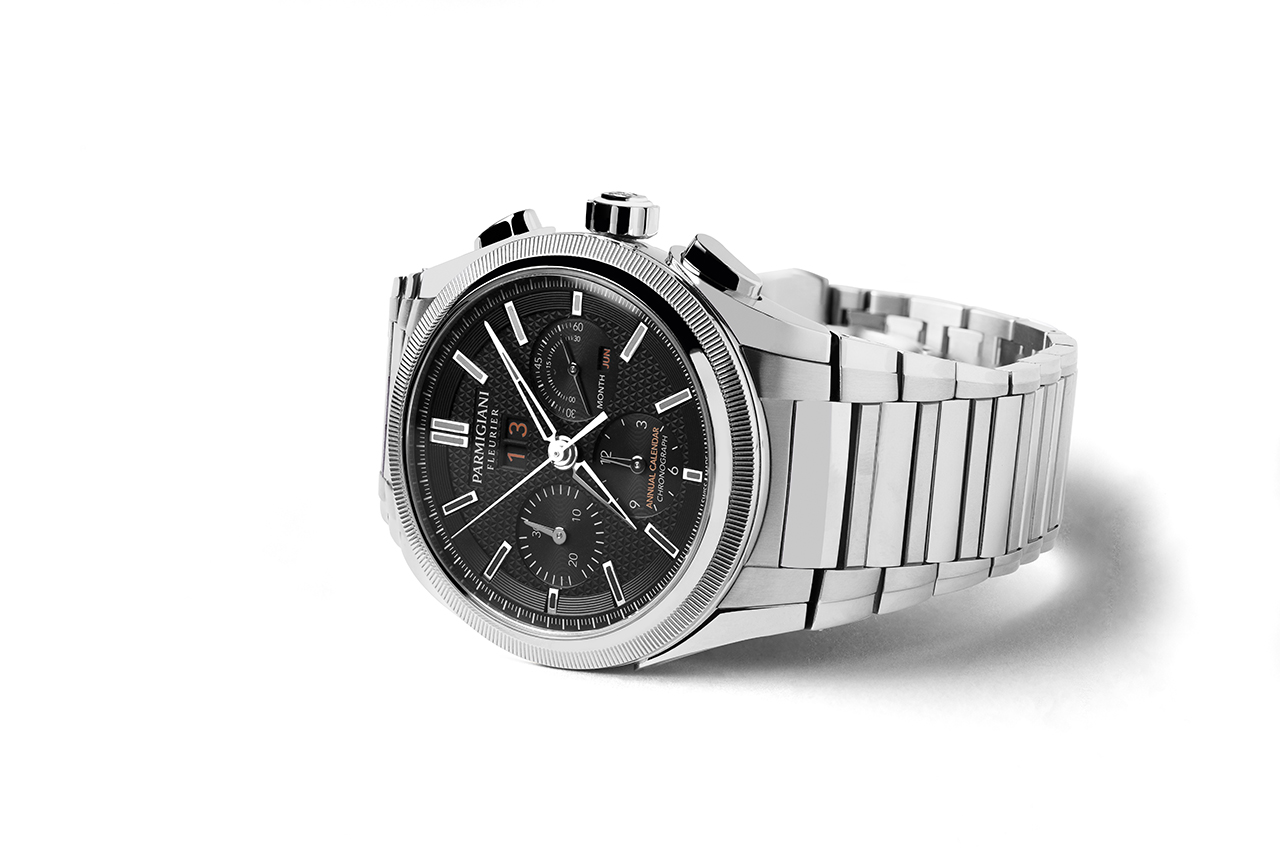 Модель Tondagraph GT работает на автоматическом калибре PF043 и обладает двумя самыми востребованными усложнениями: годовым календарем и хронографом. Этим необычным сочетанием функций Parmigiani Fleurier заполнила пробел в часовом мире, представив их в редком по уровню исполнения качестве и к тому же по исключительной цене. Циферблат изобилует указателями, но при этом легко читается. В наличии дельтовидные часовая и минутная стрелки с черным люминесцентным покрытием, малый секундный счетчик, два накопителя хронографа и большое окно указателя даты на «12 часах». Для привлечения внимания к функции годового календаря дата и месяц показываются ярким оранжевым цветом. Эти впечатляющие часы водонепроницаемы до 100 метров, имеют завинчивающуюся заводную головку, а их механизм с 45-часовым запасом хода, открытый для обзора со стороны задней крышки, украшен узором «Женевские Полосы». Тираж Tondagraph GT ограничен 200 экземплярами.