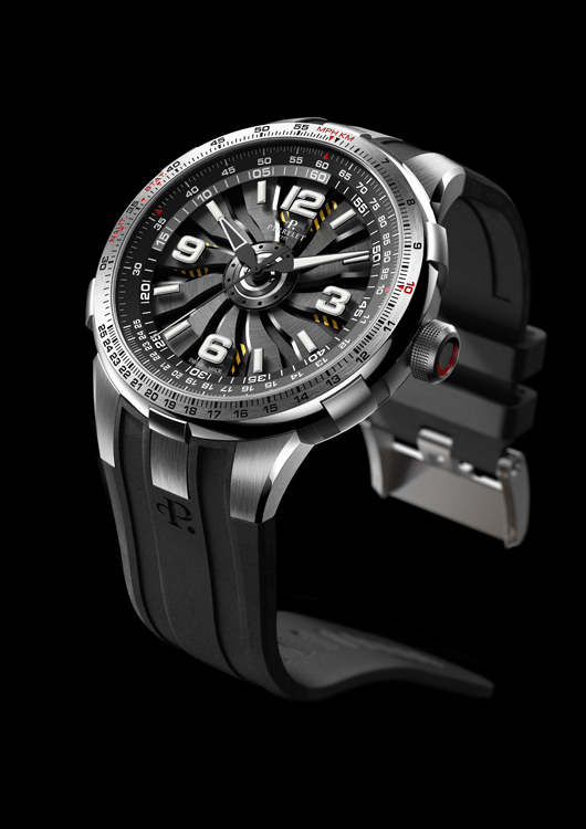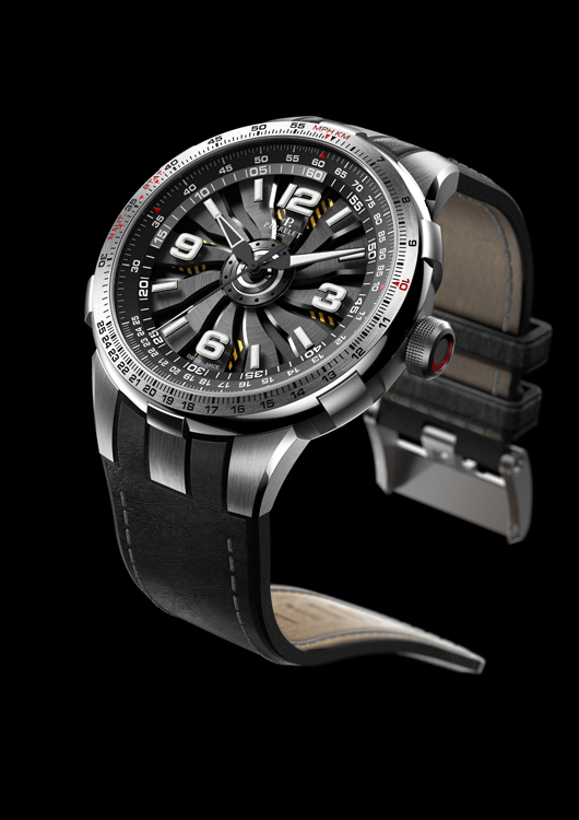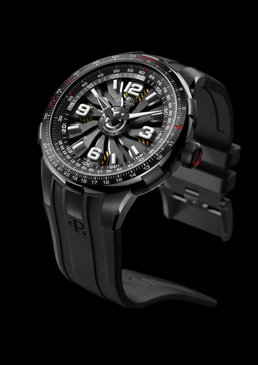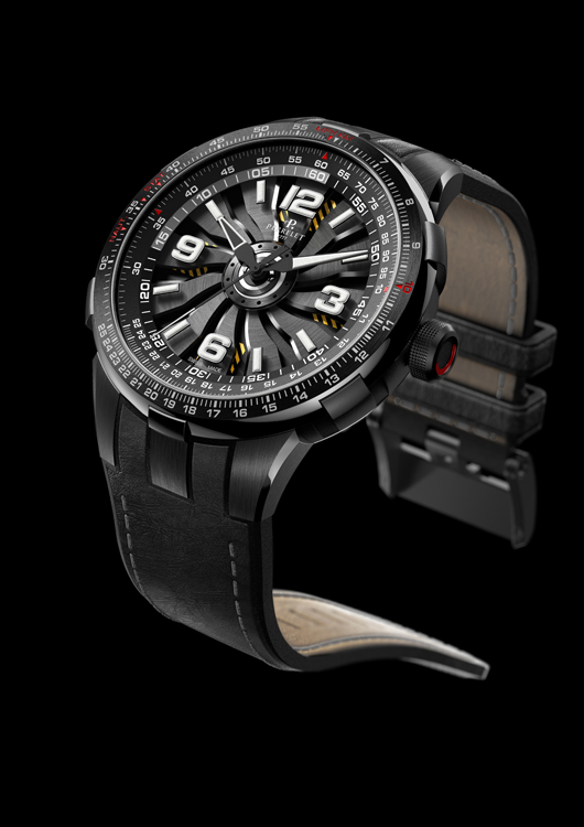 Циферблат из сапфирового стекла, безусловно, является главным элементом, привлекающим внимание к часам. Нанесенные на него белые арабские цифры и часовые индексы, с люминесцентным покрытием, расположенные над черной титановой турбиной, состоящей из 12 лопастей, контрастно выделяются на черно-желтом фоне. Вращение турбины усиливает визуальный аэродинамический эффект, создаваемый сочетанием характерных для мира авиации деталей и цветового решения циферблата. Безукоризненно продуманное многоуровневое расположение элементов циферблата придает внешнему облику часов видимость трёхмерного пространства.