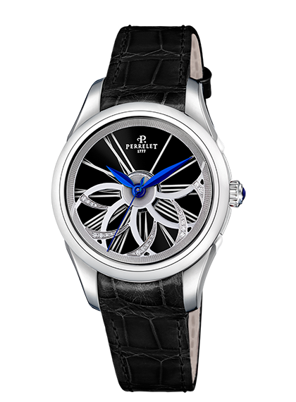 Изысканно-изящные модели женских часов «Perrelet Diamond Flower Amytis» с контрастной цветовой палитрой, драгоценными камнями и визуальной магией двойного ротора комплектуются кожаными ремешками белого и чёрного цвета, и снабжены надёжной клипсовой застёжкой из нержавеющей стали.
