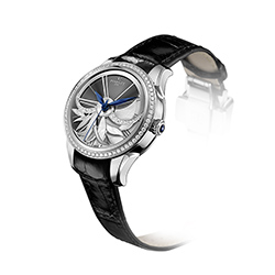 3. Модель A2066/4: гравированный циферблат из перламутра антрацитового и белого цвета, оригинальные римские цифры, двойной ротор в форме ажурных лепестков, инкрустированных бриллиантами, безель с бриллиантовой отделкой – 80 бриллиантов (1,02 карата) Top Wesselton, VS1, чёрный ремешок из кожи аллигатора. | |