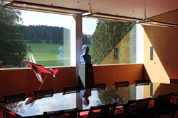 После авиашоу - конечно, не в тот же день, чтобы не смешивать впечатления - мы посетили фабрику Breitling в Ля Шо-де-Фон и штаб-квартиру Breitling в Гренхене. Всех потрясли виды из окон переговорных и производственных помещений фабрики. Знаете, в рекламах часто красиво рассказывают о том, как «тихими долгими вечерами швейцарцы в горах собирают часы» - так вот, за исключением долгих вечеров, это правда. За окнами переговорной комнаты виднелись склоны гор, альпийские луга с нежно-зеленой травой, которую мирно щипали породистые швейцарские буренки. Мы перешли в цех - и что же, в окне, разумеется, виднелись те же луга и коровы. Вид - как будто ты находишься в отеле среди гор, а вовсе не на работе - если бы не специалисты в белых халатах. Поскольку производство часов предполагает идеальную чистоту и отсутствие пыли, то каждый час в помещениях полностью меняется воздух - на свежий и чистый.