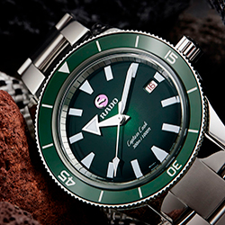 - Вращающийся безель из нержавеющей стали со вставкой из полированной высокотехнологичной керамики зеленого цвета, на которой выгравированы металлизированные цифры и деления.