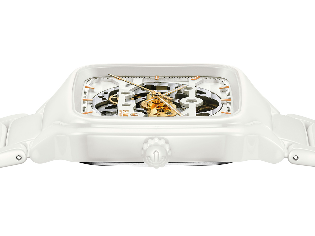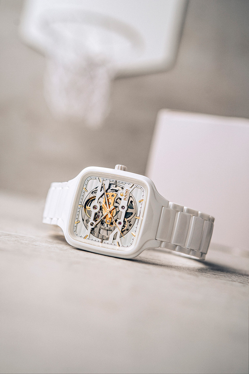 Настоящий квадратный скелет сохраняет культовый квадратный вид, который долгое время тесно ассоциировался с Rado, дополненный великолепным примером «искусства скелетонирования». Все ссылки отражают четкий, сдержанный дизайн коллекции. Параллельные горизонтальные линии делят циферблат на три части, подчеркивая геометрическую гармонию и ключевые детали механизма. Верхняя часть привлекает внимание к сердцевине часов – балансу и пружине NivachronTM, в то время как в центральной части представлены стрелки, мост минутного колеса и драгоценные камни механизма, а в нижней части – корпус, связанный с запасом хода. Черные, плазменные и белые моноблочные футляры из высокотехнологичной керамики сочетаются с высокотехнологичными браслетами ceramic link тех же оттенков для обеспечения исключительного комфорта, легкости и красоты.