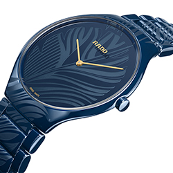 Для своих часов из коллекции True Thinline Евгения выбрала глубокий благородный синий цвет. По ее мнению, он имеет большое философское и символическое значение и является олицетворением мудрости, благородства и духовности. Насыщенный глубокий цвет подчеркнут при помощи контрастных стрелок цвета розового золота и металлизированного логотипа компании Rado.