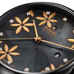 Вторая модель Chapter 2 («Глава 2») также посвящена жасмину. Более строгое в целом исполнение из черной высокотехнологичной керамики дополняет роскошный перламутровый циферблат, украшенный цветами жасмина в цвете розового золота и бриллиантовыми индексами Top Wesselton. Задняя крышка из титана с PVD покрытием черного цвета. Внутри часов аналогичный механизм Rado калибра R763, что и в других моделях, оснащенный антимагнитной пружиной NivachronTM, которая обеспечивает надежную защиту и исключительную точность.