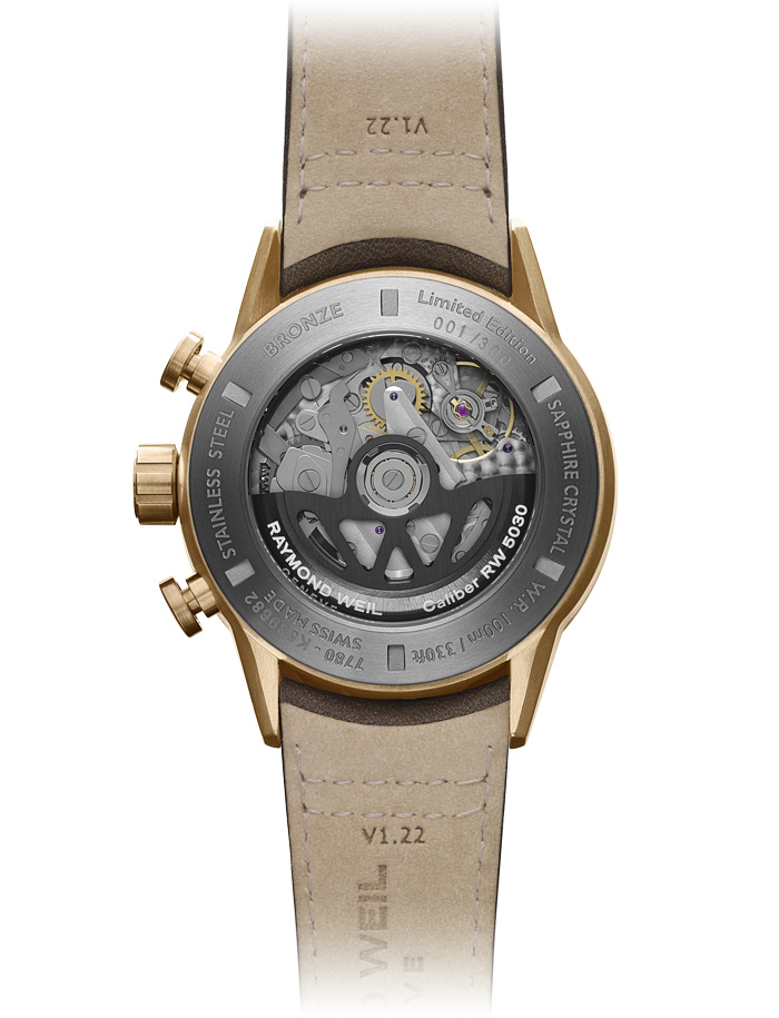 На кастомизированном мотоцикле марки Meister Engineering надпись RAYMOND WEIL украшает топливный бак, где логотип изображен на фоне цвета розового золота. Это послужило источником вдохновения для 43,5 миллиметрового бронзового корпуса и двух счетчиков хронографа. Аналогичным образом краска мотоцикла с эффектом градиента повлияла на черный дымчатый циферблат часов. Последняя деталь придает циферблату интересный вид: светлые тона в центре циферблата переходят в более темный оттенок у края.