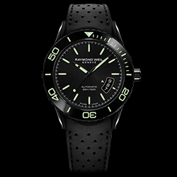 2. Raymond Weil Freelancer Automatic Date 2760-SB1-20001 Корпус из нержавеющей полированной стали с PVD-покрытием чёрного цвета, чёрный керамический безель с зелёной люминесцентной шкалой. Чёрный циферблат с центральными стрелками и условными индексами с зелёным люминесцентным покрытием. Окошко даты. Чёрный каучуковый перфорированный ремешок, раскладывающаяся застёжка с двойной фиксацией из нержавеющей полированной стали с PVD-покрытием чёрного цвета. |