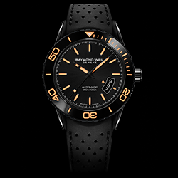 3. Raymond Weil Freelancer Automatic Date 2760-SB2-20001 Корпус из нержавеющей полированной стали с PVD-покрытием чёрного цвета, чёрный керамический безель с оранжевой люминесцентной шкалой. Чёрный циферблат с центральными стрелками и условными индексами с оранжевым люминесцентным покрытием. Окошко даты. Чёрный каучуковый перфорированный ремешок, раскладывающаяся застёжка с двойной фиксацией из нержавеющей полированной стали с PVD-покрытием чёрного цвета. |