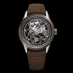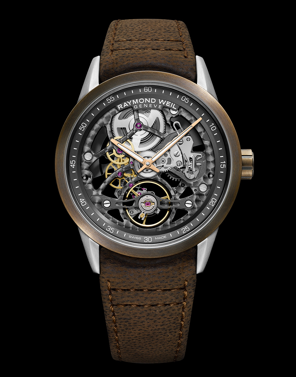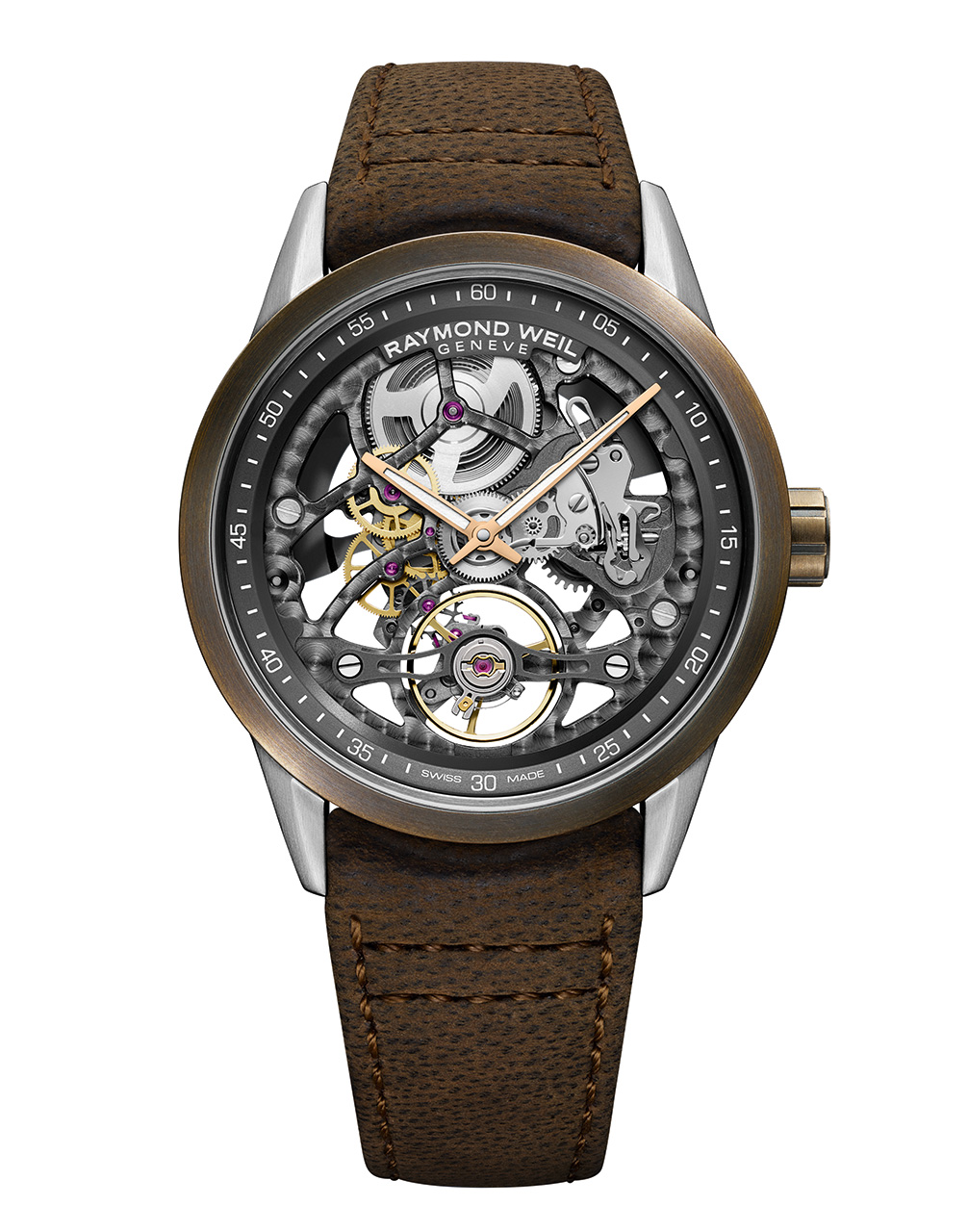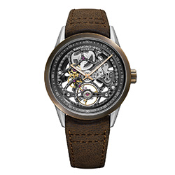 В новой скелетонизированной модели часов Freelancer с калибром RW1212 от RAYMOND WEIL сочетаются благородные материалы и швейцарское часовое мастерство. Часы, заключенные в корпус из нержавеющей стали диаметром 42 мм с массивным бронзовым безелем, имеют уникальную патину. Скелетонизированный циферблат позволяет полностью видеть эксклюзивный механизм, разработанный швейцарским часовым Домом с акцентом на мост и колесо баланса в положении «6 часов». Ремешок из состаренной коричневой кожи придает новой модели часов благородный винтажный вид.