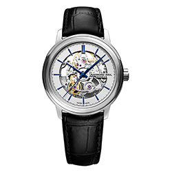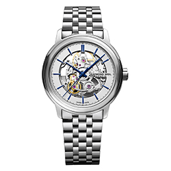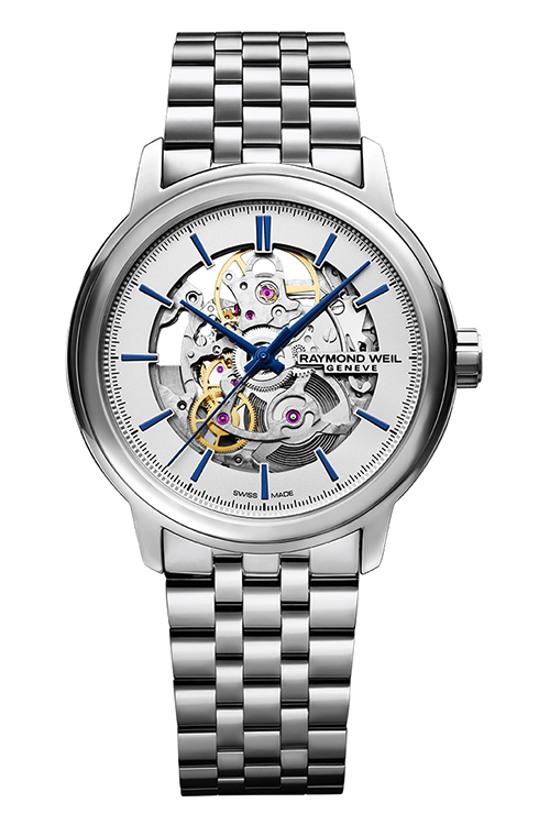 В модели Skeleton нет ничего лишнего — только самые необходимые атрибуты времени. Корпус новых часов Maestro от RAYMOND WEIL изготовлен из нержавеющей стали, его диаметр составляет 39,5 мм. Циферблат дополнен часовой, минутной и центральной секундной стрелками, которые изготовлены из стали синего цвета. Глядя на них, создается впечатление, будто они парят над пространством часового механизма.