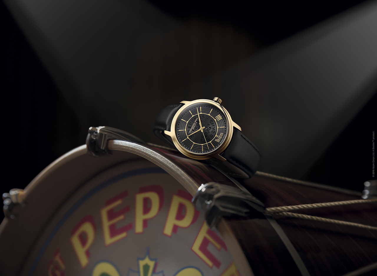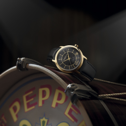 Среди примечательных особенностей оформления циферблата — знаменитый барабан с обложки альбома, вдохновившего на создание этих элегантных часов. На фоне серого циферблата с черным рисунком барабана в центре хорошо заметны детали из гальванизированного желтого золота. Среди них наружные очертания барабана, логотип The Beatles в положении «6 часов» и выделяющаяся в общем ряду метка в положении «4 часа». Эта модель — прекрасная дань памяти легендарной рок-группе и ее культовому альбому Sergeant Pepper.