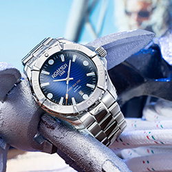 Модель DEEP SEA 200 оснащена сапфировым стеклом с антибликовым покрытием и 43-миллиметровым корпусом из нержавеющей стали в форме круга, в котором установлен надежный высококачественный кварцевый механизм швейцарского производства. Декоративный волнистый циферблат серебристого, черного или синего цвета привлекает внимание любителей как спортивного стиля, так и классики. Корпус и браслет выполнен из нержавеющей стали 316L.