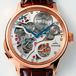 В составе Credor Spring Drive Minute Repeater свыше 660 компонентов. Все основные части механизма тщательно отполированы вручную высококлассными мастерами часовой студии Micro Artist. Изящество их работы доступно невооруженному взгляду сквозь сапфировое стекло с лицевой стороны часов и прозрачную крышку с обратной стороны корпуса. Особого внимания заслуживают завораживающая красота лезвий бесшумного регулятора с фронтальной стороны часов и бой молоточков, которые можно увидеть сквозь прозрачную заднюю крышку.