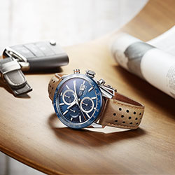 Самая запоминающаяся из четырех новых моделей — синие часы со светло-коричневым кожаным ремешком. Новые TAG Heuer Carrera представлены на перфорированном ремешке из телячьей кожи, а внутренняя сторона ремешка выполнена в оранжевом оттенке. В таком же цветовом решении отмечены и акценты на циферблате. Модель также представлена с синим циферблатом на браслете из нержавеющей стали. Коллекцию дополнили часы с черным циферблатом на браслете из нержавеющей стали и на ремешке из черной кожи с красной прострочкой.