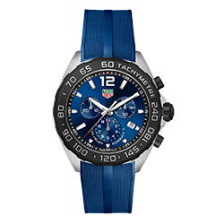TAG Heuer Formula 1 Chronograph создан под влиянием мира гонок и скорости. Синий циферблат с тремя счётчиками и красными акцентами подчёркивает динамичный характер модели, а чёрный тахиметрический безель усиливает спортивный образ.
