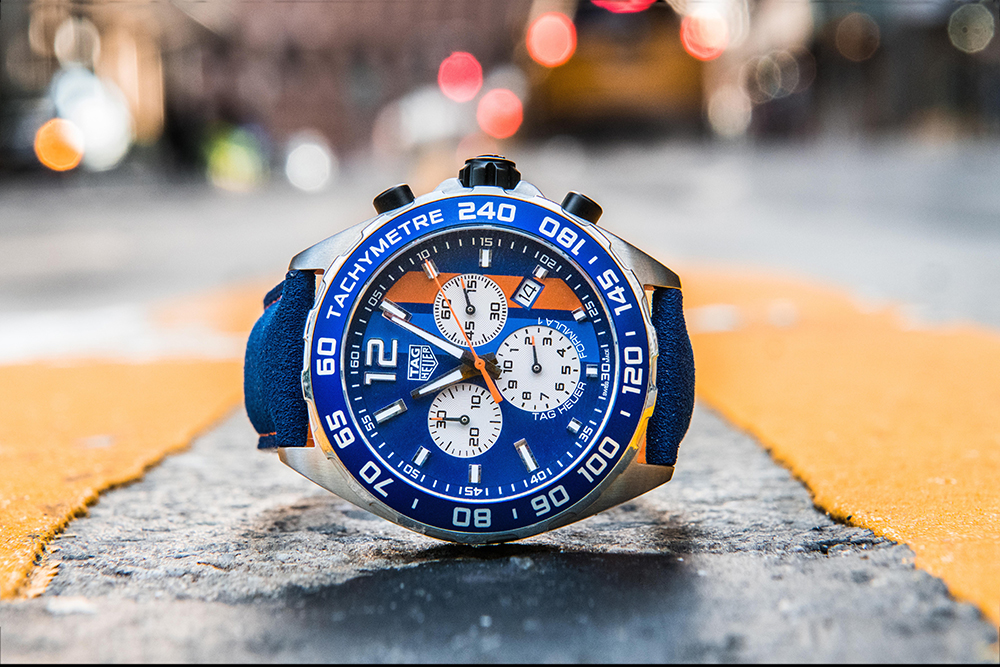 Две флагманские модели коллекций TAG Heuer выполнены в легендарных цветах компании Gulf – оранжевом и синем. Часы TAG Heuer Formula 1 идеально подходят для автоспорта – это синоним производительности и скорости. Изготовленный полностью из стали, с корпусом диаметром 43 мм этот кварцевый хронограф имеет рифленый безель из стали и кольцо из алюминия с нанесенной на него тахиметрической шкалой. Синяя и оранжевая полосы на циферблате напоминают об истории создания модели. О принадлежности к знаменательному событию свидетельствует логотип Gulf, выгравированный на задней крышке корпуса. Малый счетчик, который позволяет определить время с точностью до десятых долей секунды (что важно в часах для автомобильных гонок), расположен на отметке «6 часов». На отметке «9 часов» находится счетчик минут, а счетчик секунд – на отметке «3 часа». Модель TAG Heuer Formula 1 дополнена красивым ремешком из кожи синего цвета с оранжевой отстрочкой в стиле «спортивный шик».