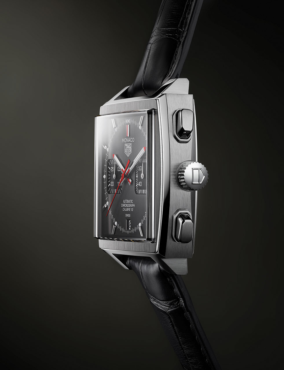 В отличие от изначального механизма Monaco Calibre 11 новый Calibre 12 обновил внешний вид знаменных часов. Теперь заводная головка расположена с правой стороны корпуса – вместо левой, как это было с Calibre 11. TAG Heuer представляет последнюю модель Calibre 12 Monaco с потрясающим серым циферблатом. Модель из нержавеющей стали оснащена классическим черным ремешком из кожи аллигатора с матовым рутениевым циферблатом. Рутений является частью платиновой группы и переливается разными оттенками в зависимости от источника света. Гладкие черные опаловые счетчики в позициях 3 и 9 часов создают изысканный контраст с матовым циферблатом. Центральная секундная стрелка, 12-часовой указатель и кончики часовой и минутной стрелок ярко-красного оттенка подчеркивают современный стиль этой легендарной модели. Всего выпущено 1000 экземпляров Monaco Calibre 12 Final Edition, а на корпусе из нержавеющей стали каждой модели выгравирован ее лимитированный номер. (6,7)