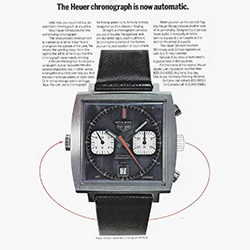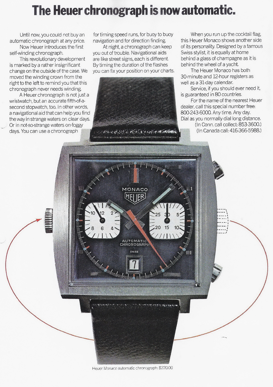 Когда 3 марта 1969 года новые часы Heuer Monaco (TAG в то время еще не был частью названия компании) представили одновременно на двух пресс-конференциях – в Нью-Йорке и Женеве – реакция публики на них была неоднозначной. Дизайн часов был радикальным во всех отношениях: металлический синий циферблат, красные и голубые стрелки, квадратный корпус и размещение заводной головки с левой стороны. «Нам хотелось создать выдающийся инновационный продукт, нечто авангардное», – прокомментировал почетный председатель правления TAG Heuer Джек Хоэр. «При виде квадратного корпуса я сразу понял, что это именно то, что нужно. До этого такой корпус имели только часы представительского класса, поскольку их невозможно было сделать водонепроницаемыми. Но мы пошли наперекор времени и предложили именно такой нестандартный дизайн для наручного хронографа Monaco».