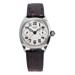 Циферблат украшен логотипом «Heuer» в винтажном стиле и надписями: «Monza – Automatic – Calibre17».