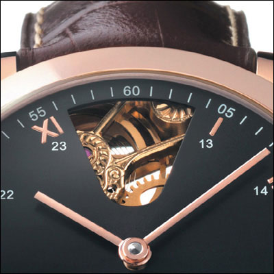 Ультрасовременный дизайн чёрного или серебристого, частично скелетонизированного циферблата гармонично соединяется классическими элементами – плавными линиями, полированными поверхностями, изящными узкими стрелки и крупными римскими цифрами из розового золота.
