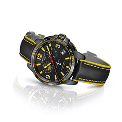 Наряду с функциями спортивный характер хронометра с диаметром корпуса 42 мм подчеркивает его внешний вид. Это гоночная коллекция выпущена в честь сотрудничества швейцарского производителя с ADAC GT Masters. Данный факт объясняет цветовую гамму, в которой выполнена линейка часов – это официальные цвета гонки. Лакированная желтая тахиметрическая шкала выделяется на фоне безеля с PVD-покрытием черного цвета. Стрелки и индексы красного и белого цветов, покрытые желтым люминесцентным составом Super-LumiNova®, резко контрастируют с циферблатом. Тем самым обеспечивают отличную видимость показаний. Акценты желтого цвета на заводной головке, эргономичные кнопки-пушеры и прострочка кожаного спортивного ремешка служат завершающими штрихами к истинно гоночным часам.